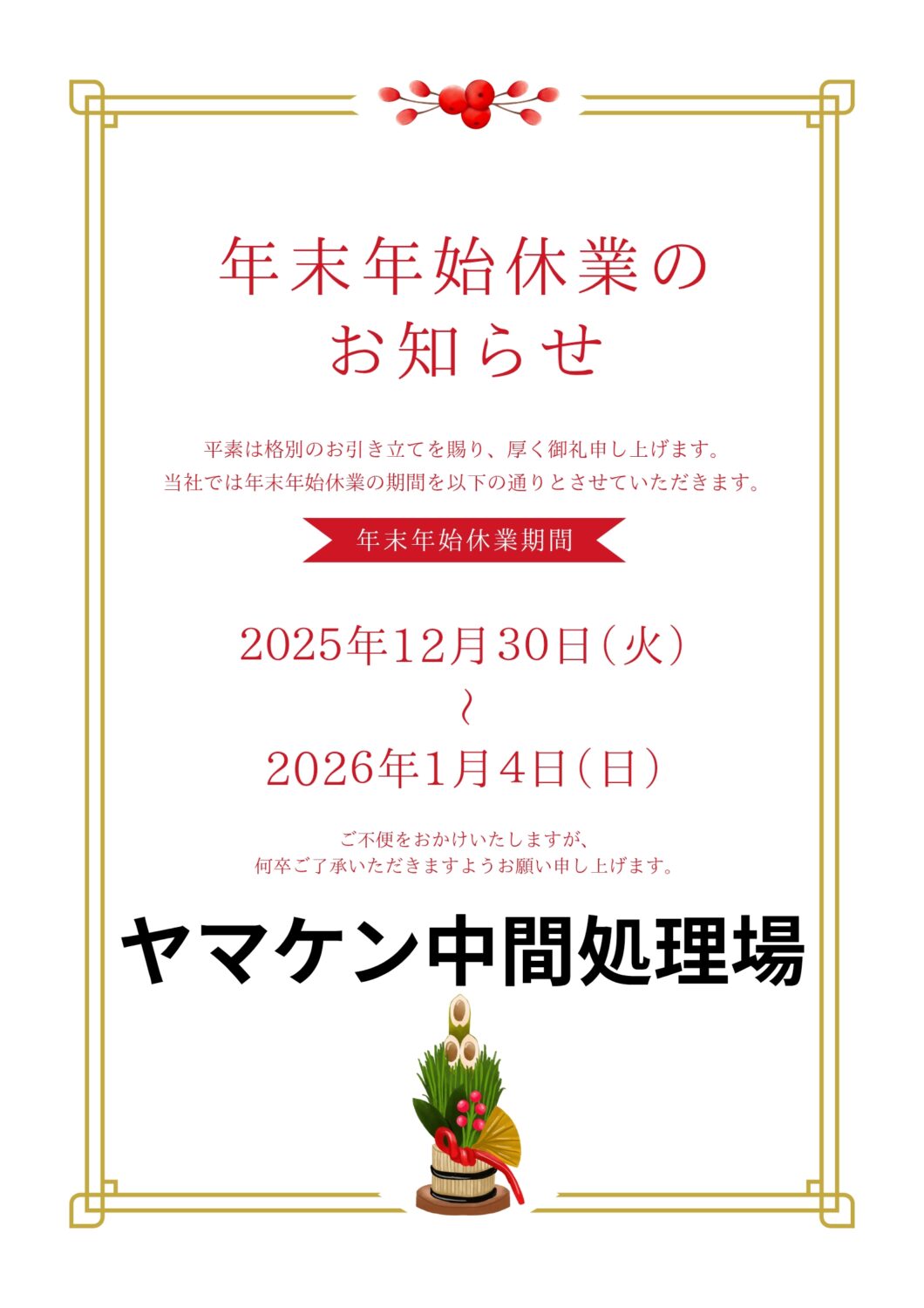 年末年始休業日のお知らせ!